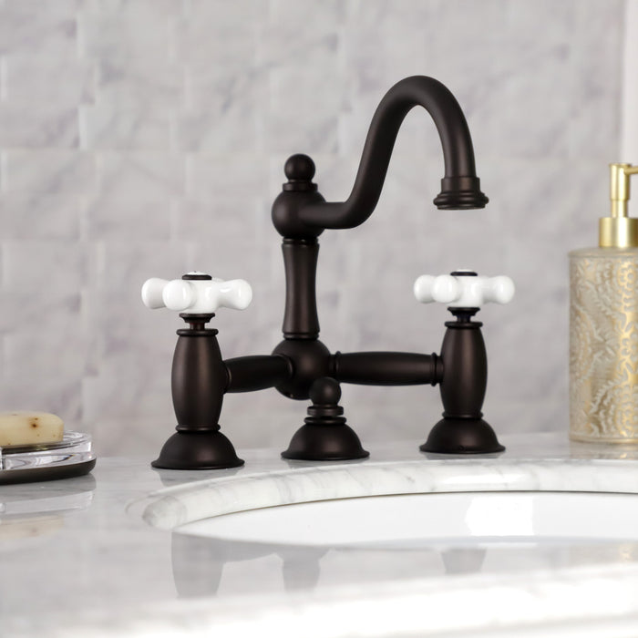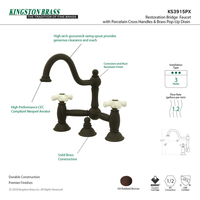 Kingston Heirloom KS3915PX - Restoration Two-Handle 3-Hole Deck Mount Bridge Bathroom Faucet with Brass Pop-Up, Oil Rubbed Bronze