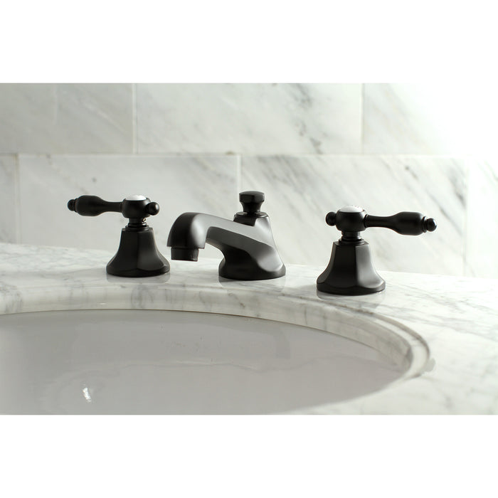 Kingston Tulare KS4460TAL - Tudor Two-Handle 3-Hole Deck Mount Widespread Bathroom Faucet with Brass Pop-Up, Matte Black