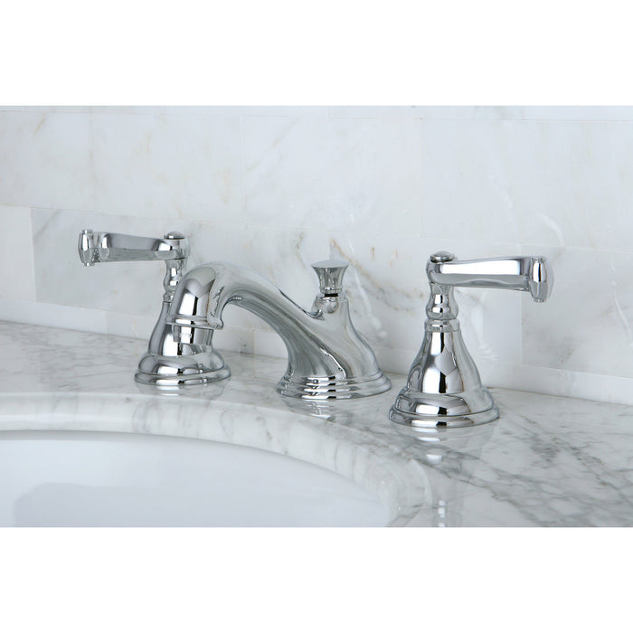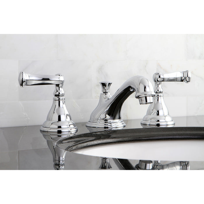 Kingston Tulare KS5561FL - Royale Two-Handle 3-Hole Deck Mount Widespread Bathroom Faucet with Brass Pop-Up, Polished Chrome