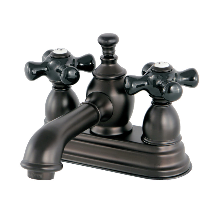Crafted in commendations to English nobility, the exemplary design of this faucet manifests regality and elegance with its black porcelain handles. Centerset bathroom faucets are ideal for smaller bathrooms and feature an easy 3-hole installation. The Duchess 4-inch centerset bathroom faucet with brass pop-up and its featured sturdy brass construction and premium oil rubbed bronze finish are guaranteed to glamorize your home's traditional ensemble for years to come. Glamorize your home today with the traditional elegance of this faucet. A matching finish drain is also included.