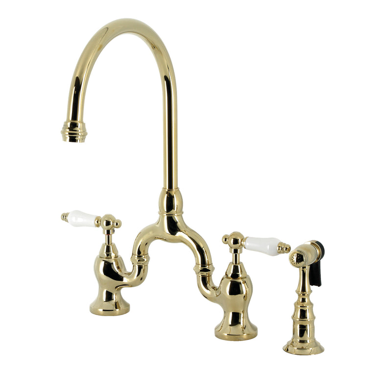 Kingston Heirloom KS7792PLBS - English Country Two-Handle 3-Hole Deck Mount Bridge Kitchen Faucet with Brass Sprayer, Polished Brass