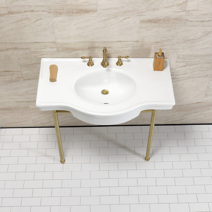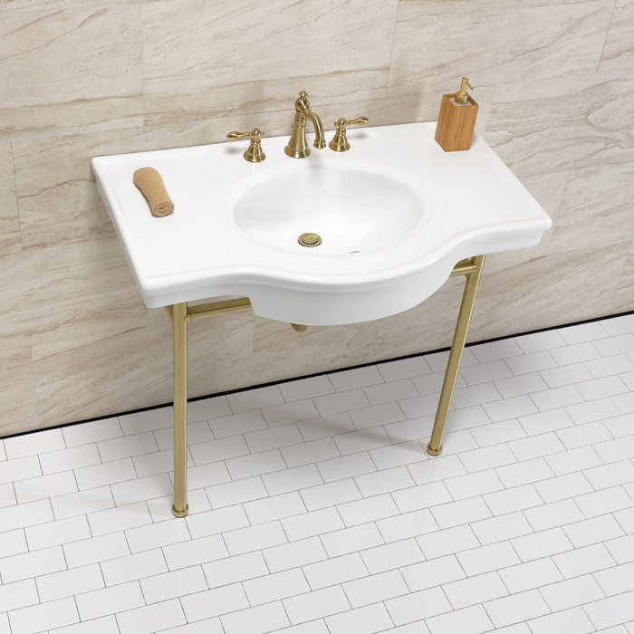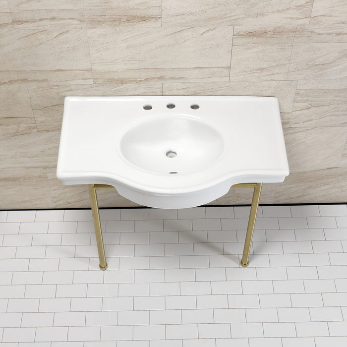 Kingston Tulare VPB28140W8BB - Manchester 37-Inch Ceramic Console Sink with Stainless Steel Legs (8-Inch, 3-Hole), White/Brushed Brass