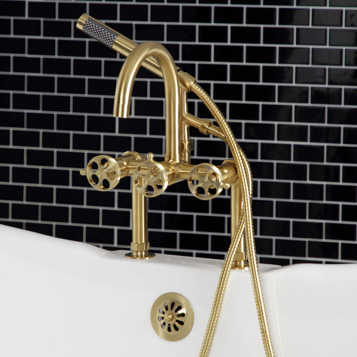 Kingston Sona AE8107RKX - Webb Three-Handle 2-Hole Deck-Mount Clawfoot Tub Faucet with Knurled Handle and Hand Shower, Brushed Brass