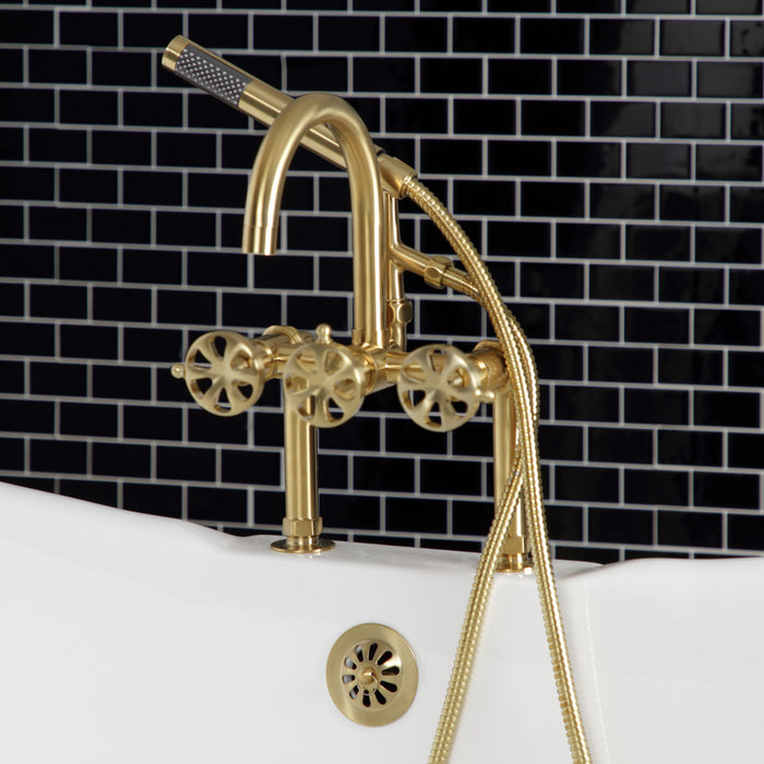 Kingston Sona AE8107RX - Belknap Three-Handle 2-Hole Deck-Mount Clawfoot Tub Faucet with Hand Shower, Brushed Brass