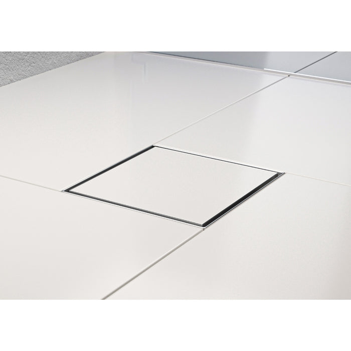 The Watercourse collection offers a variety of shower drains with multiple finish options. Choices range from simple, subtle grid-style floor drains to elaborate embossed floral patterns. The drains are compatible with both square and circular openings and can be installed in various ways. Refer to each drain's specifications for dimensions and compatibility details. One option is a minimalist 6" x 6" square flange drain. It has a solid plate that allows water to flow through narrow slots on all four sides, maintaining a streamlined look. The flange fits over a circular hair catcher, preventing debris from entering the drain while keeping an understated yet elegant style.