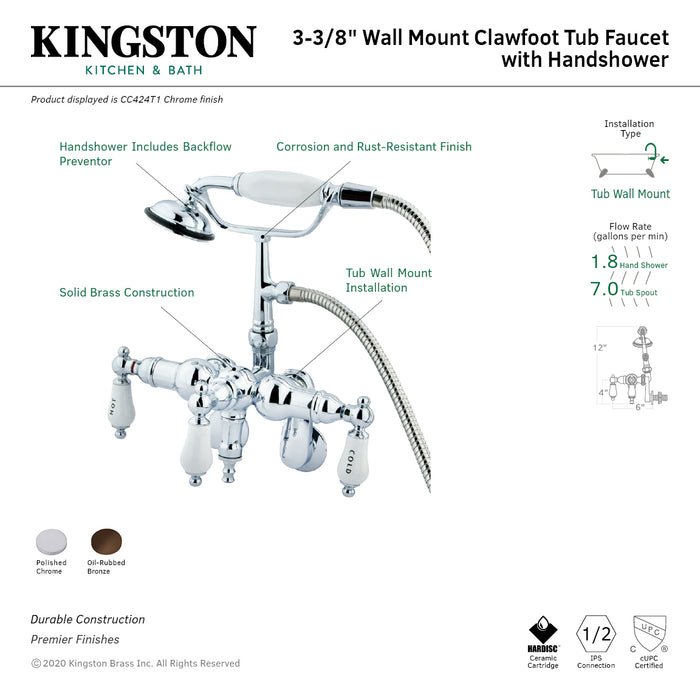 Kingston Heirloom CC423T5 - Vintage Three-Handle 2-Hole Tub Wall Mount Clawfoot Tub Faucet with Hand Shower, Oil Rubbed Bronze