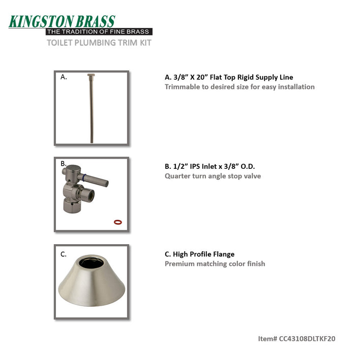 This 3-piece toilet supply kit from Kingston Brass provides all the necessary parts in the water flow process of your bathroom toilet. The set includes a single lever 1/2-14 NPT x 3/8" O.D. compression angle stop, a 20" flat head supply line, and a 1/2" IPS bell flange. Constructed of high quality brass and a tarnish-resistant finish, designed for long-lasting performance. Available in a variety of stunning finishes ready to match any home decor.