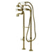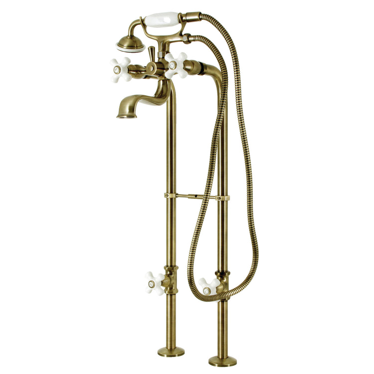 Distinguished for its elegance, sophistication, and exquisite architecture, this freestanding tub faucet is the perfect fixture for any traditional home. Allow it to both complement your freestanding tub and act as a beautiful ornamental piece in your bathroom. As the perfect accompaniment to your tub, the Kingston freestanding clawfoot tub faucet with supply lines will surely complete your refined bathroom decorum with the help of its premium, glistening antique brass finish and hand shower. The solid brass construction also makes for a heavy, quality made product. Hand shower with porcelain handle and 59-inch hose.