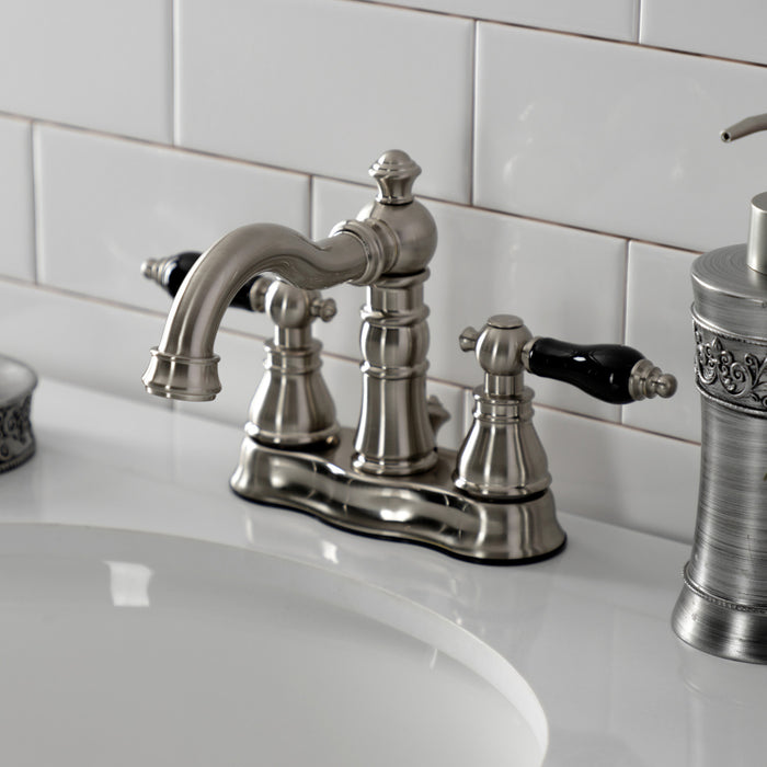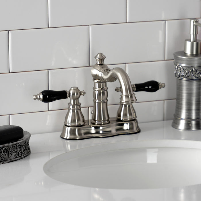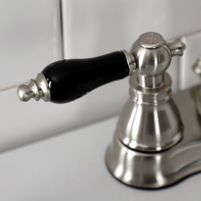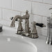 Crafted in commendations to English nobility, the exemplary design of this faucet manifests regality and elegance with its black porcelain handles. The Duchess double-handle 4" centerset bathroom faucet with brass pop-up and its featured sturdy brass construction and premium brushed nickel finish are guaranteed to glamorize your home's traditional ensemble for years to come. Centerset bathroom faucets are ideal for smaller bathrooms and feature an easy 3-hole installation. Glamorize your home today with the traditional elegance of this faucet. A matching finish drain is also included.