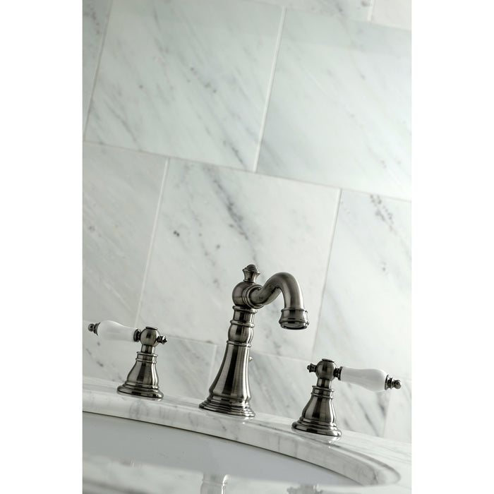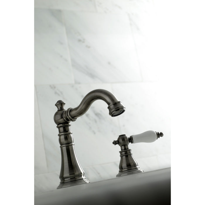 Orchestrated with the flow of the ever-present porcelain lever handles, this faucet prevails a whimsical tune of design to accompany its traditional detailing. Ideal for more spacious bathrooms, widespread faucets are more spread apart and feature a 3-hole installation. The American Patriot widespread bathroom faucet and its featured sturdy brass construction and premium black stainless finish are guaranteed to glamorize your home's traditional ensemble for years to come. Add a hint of vintage styling to your household with this faucet. A matching finish drain is also included.