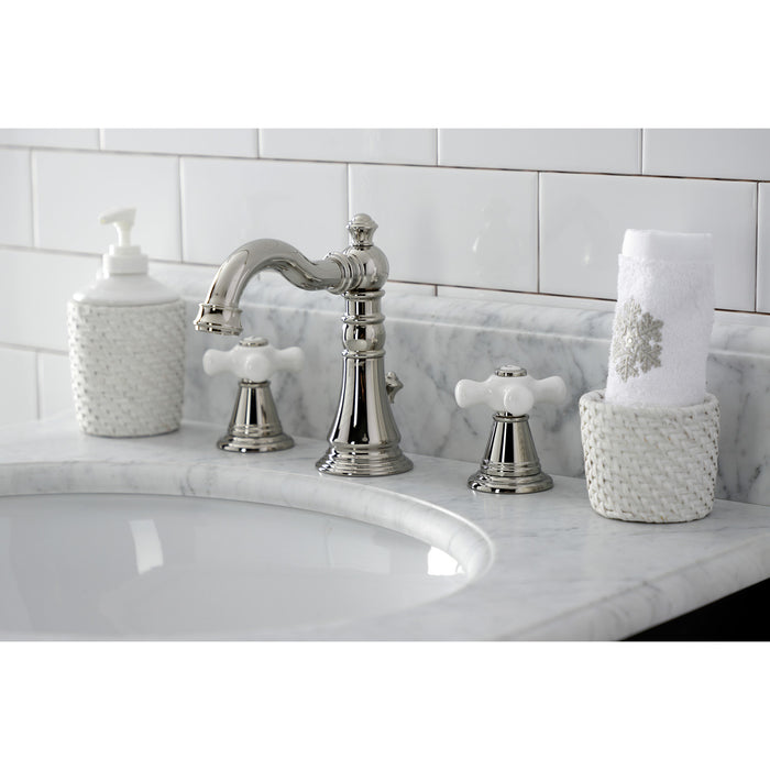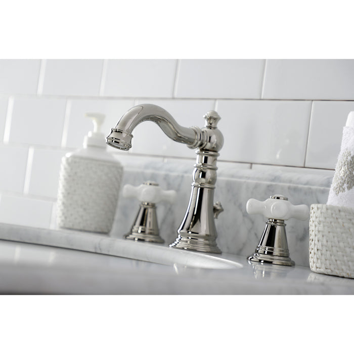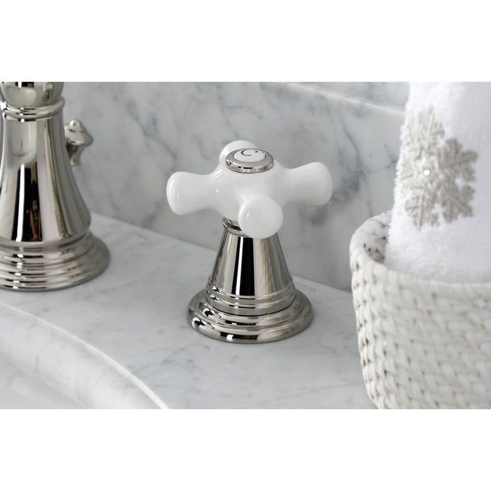 Kingston Heirloom FSC1979APX - American Classic Two-Handle 3-Hole Deck Mount Widespread Bathroom Faucet with Brass Pop-Up, Polished Nickel