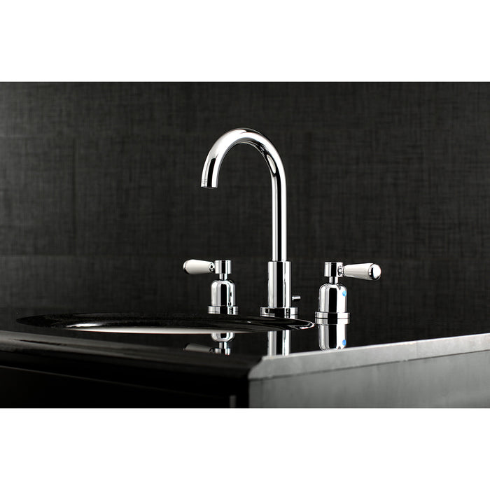 Crafted to bring aesthetic beauty alongside exceptional performance, the feature of porcelain lever handles and rounded architecture solidifies pristine refinement in this faucet. Ideal for more spacious bathrooms, widespread faucets are more spread apart and feature a 3-hole installation. The Paris 8 in. widespread bathroom faucet with brass pop-up and its featured sturdy brass construction and premium polished chrome finish are guaranteed to glamorize your home's modern ensemble for years to come. Embolden your home ensemble with the addition of this exquisite fixture. A matching finish drain is also included.