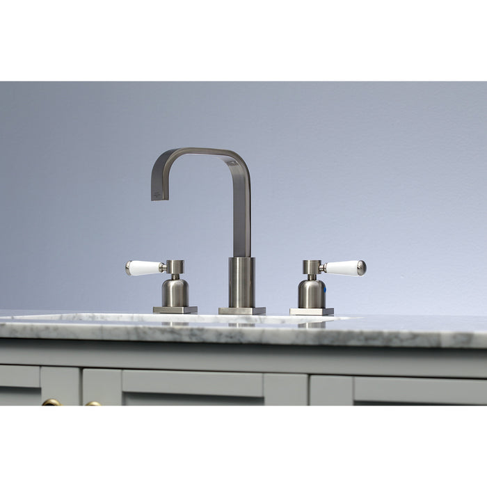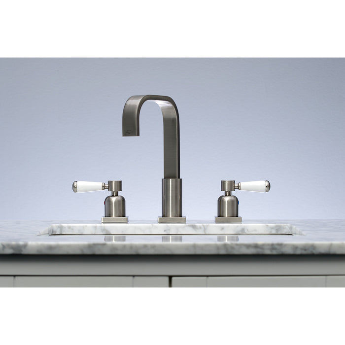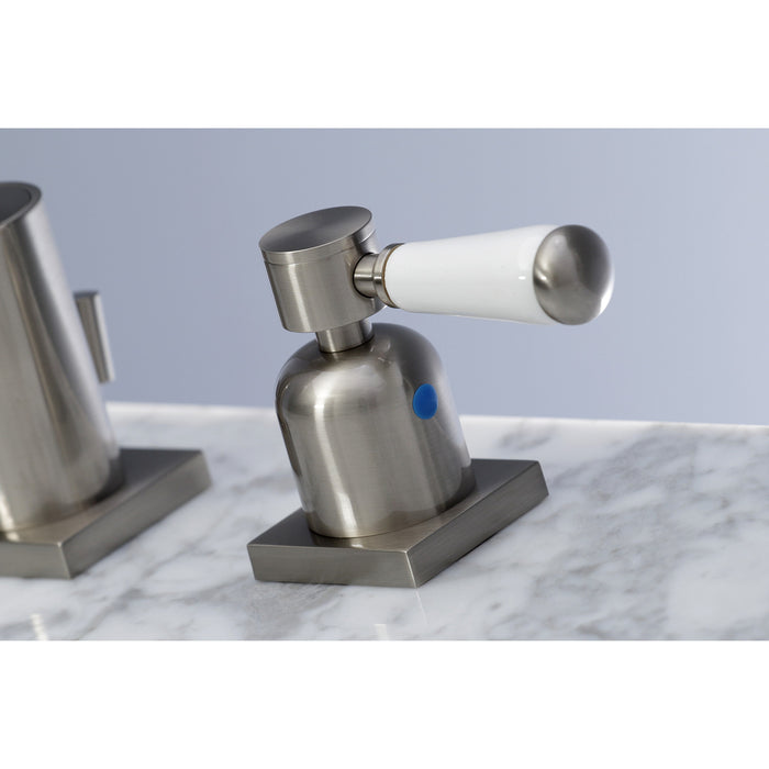 Crafted to bring aesthetic beauty alongside exceptional performance, the feature of porcelain lever handles and rounded architecture solidifies pristine refinement in this faucet. Ideal for more spacious bathrooms, widespread faucets are more spread apart and feature a 3-hole installation. The Paris widespread bathroom faucet and its featured sturdy brass construction and premium brushed nickel finish are guaranteed to glamorize your home's modern ensemble for years to come. Embolden your home ensemble with the addition of this exquisite fixture. A matching finish drain is also included.
