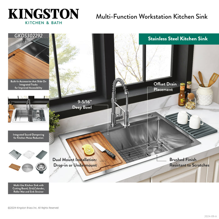 Kingston Sona GKDS302292 - Uptowne 30-Inch Stainless Steel Single Bowl Dual Mount Kitchen Sink with 6-Piece Kitchen Accessory Set, Brushed