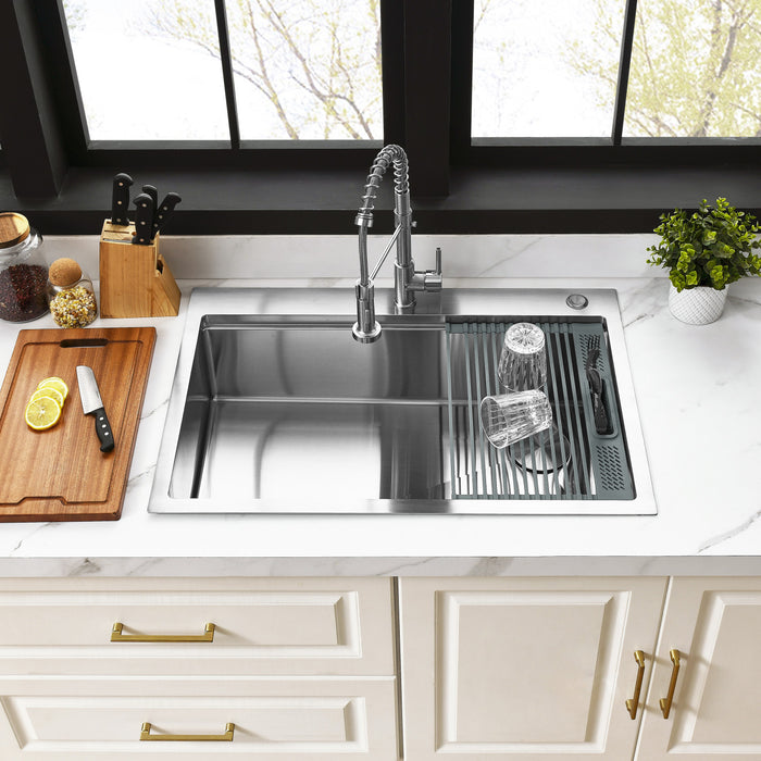 The Uptowne collection brings forth bold design and smooth lines, enhancing your contemporarily styled home. The Uptowne 30" Stainless Steel Single Bowl Dual Mount Kitchen Sink is constructed from high quality 18-10, 304 grade rust-resistant stainless steel. The 0 radius corners, 9-5/16” deep bowl and offset drain placement will give you ample space to tackle any kitchen chore. The brushed finish is also resistant to scratches, and with the sink's sound dampening technology, sound and vibrations are reduced. This comprehensive sink combo includes a strainer, strainer cover, sink grid, steel roll-up drying rack with silicone coating, silicone drying mat, and cutting board, providing everything you need for a functional and stylish setup.