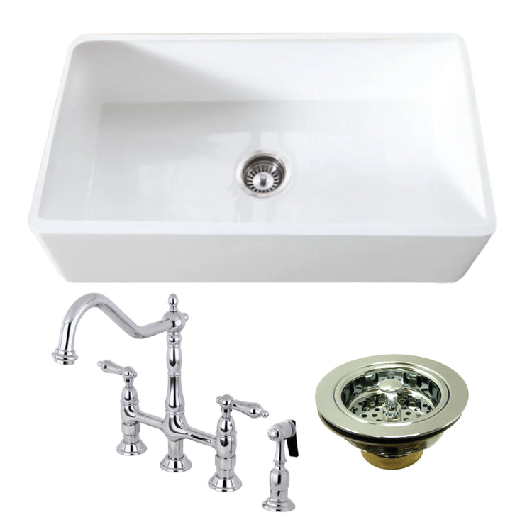Elevate your kitchen with a bold blend of traditional elegance and modern performance. This curated set includes a matte white farmhouse-style apron sink, a Victorian-inspired bridge faucet with a high-arc spout and side sprayer, and a matching spin-and-lock basket strainer. The sink’s durable solid surface construction pairs beautifully with the faucet’s vintage detailing, making this set a stunning focal point for classically styled kitchens.