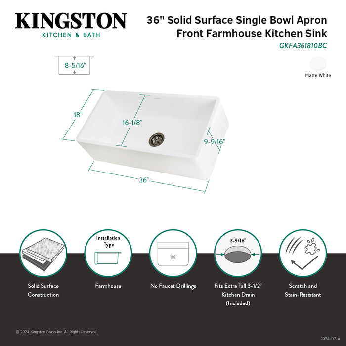 Kingston Tulare GKFA361810BC - Arcticstone 36-Inch Solid Surface White Stone Apron-Front Single Bowl Farmhouse Kitchen Sink with Strainer, Matte White