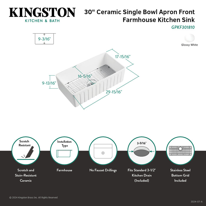 Kingston Kaolin GPKF301810 30-Inch Ceramic Apron-Front Single Bowl Farmhouse Kitchen Sink with Bottom Grid and Strainer, Glossy White