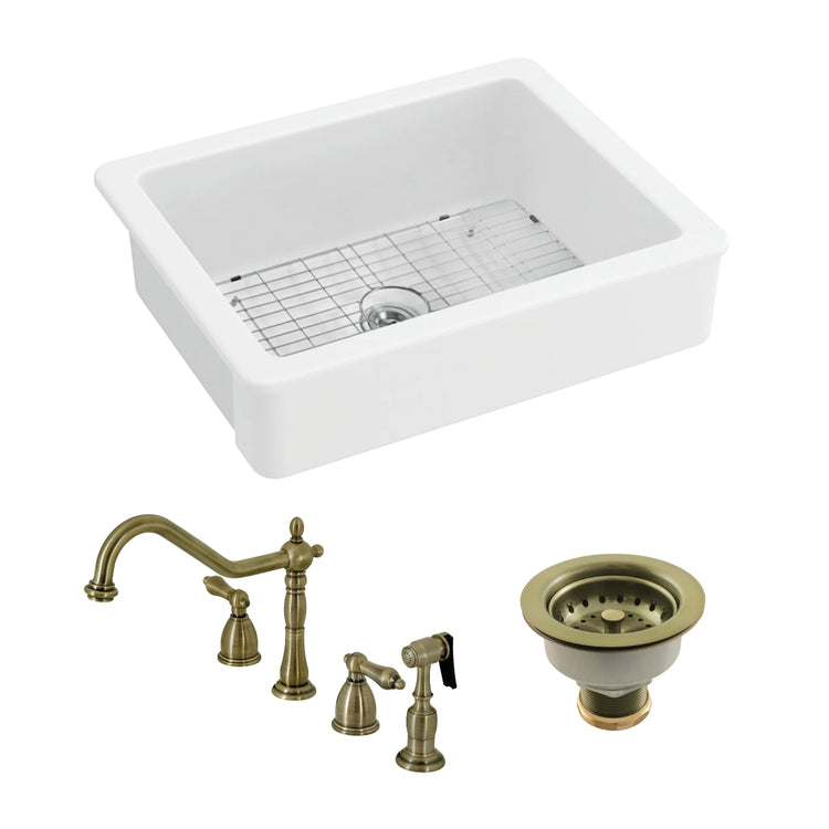 Kingston Brass Kitchen Sink Combo - Kaolin 30-Inch Ceramic Single Bowl Farmhouse Kitchen Sink with Widespread Kitchen Faucet with Sprayer and Basket Strainer, Antique Brass