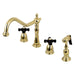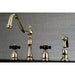 Crafted in commendations to English nobility, the exemplary design of this faucet manifests regality and elegance with its black porcelain handles. Able to fit a variety of sink set-ups, widespread kitchen faucets can be utilized in several multi-hole configurations. These are ideal for larger kitchens, as they are more spread apart, and with the included side-sprayer feature a 4-hole installation. The polished brass finish will also add a glistening elegance to your kitchen ensemble. Allow the brass construction to provide a sturdy and reliant fixture.