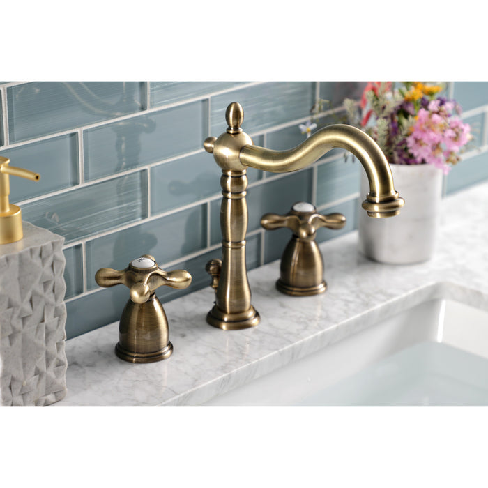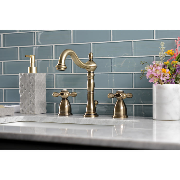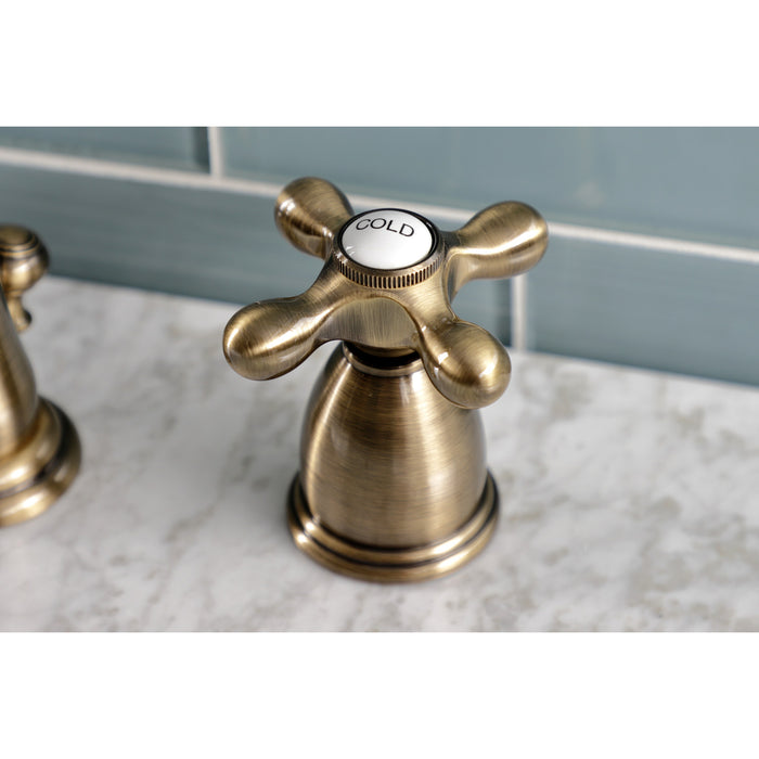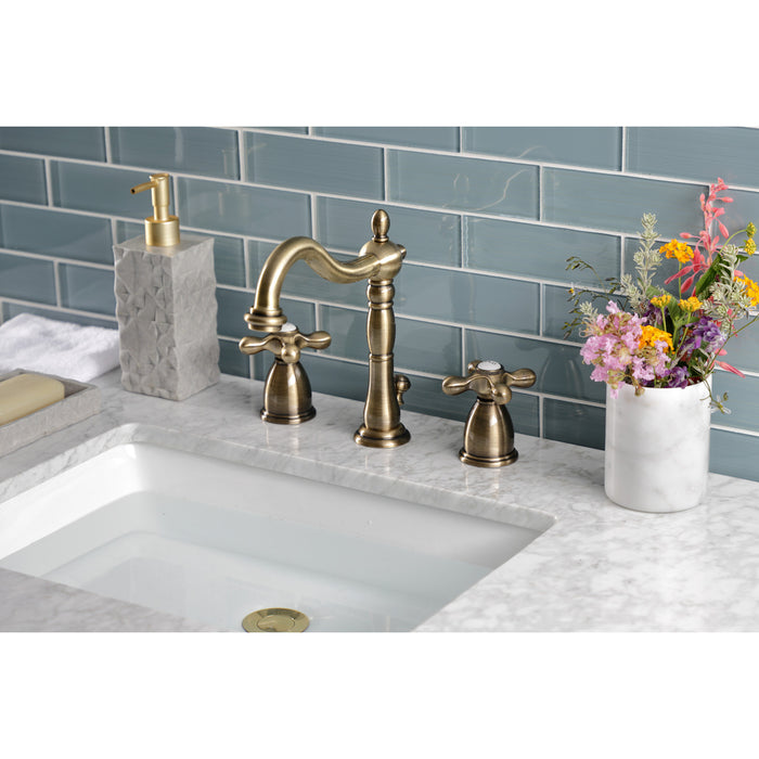 Kingston Heirloom KB1973AX - Heritage Two-Handle 3-Hole Deck Mount Widespread Bathroom Faucet with Brass Pop-Up, Antique Brass