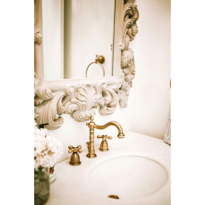 A lavish spark of traditionally stylized glamour is brought to your bathroom ensemble with this beautiful faucet. Ideal for more spacious bathrooms, widespread faucets are more spread apart and feature a 3-hole installation. The Heritage 8" Widespread Bathroom Faucet, with its featured sturdy brass construction and premium antique brass finish, are guaranteed to glamorize your home's traditional ensemble for years to come. Celebrate sophistication and traditional decor with this statement piece. A matching finish drain is also included.