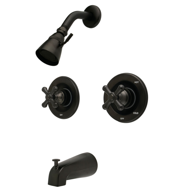 Return to the antique designs of the early 20th Century with this tub and shower faucet, offering detailings of refined splendor and ornate design to your home. Complete with easy-to-turn cross handles, an optimum bathing experience awaits. Enjoy the sturdy brass construction and premium oil rubbed bronze finish for a fixture that will last for years to come. A pressure balanced valve is included for safety and protection against accidental burns.