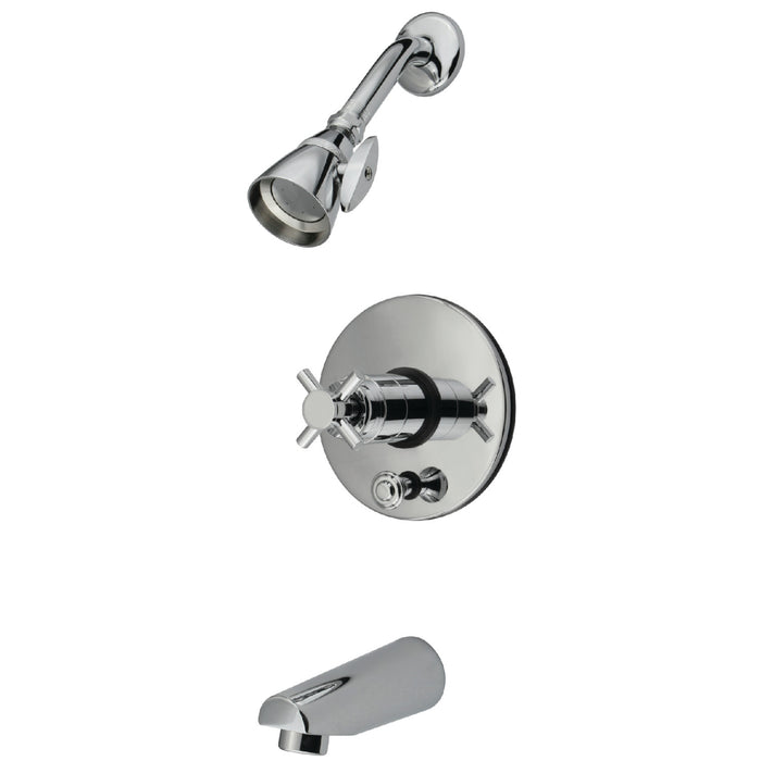 Dive into modern design with the sleek and cylindrical styling of this tub and shower faucet. Complete with an easy-to-turn cross handle, an optimum bathing experience awaits. Enjoy the sturdy brass construction and premium polished chrome finish for a fixture that will last for years to come. A pressure balanced valve is included for safety and protection against accidental burns.