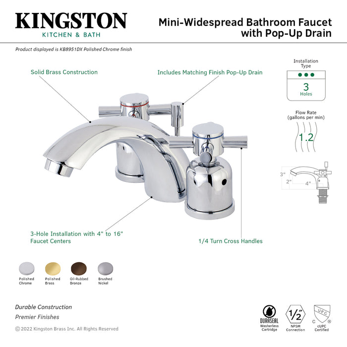 Kingston Tulare KB8958DX - Concord Two-Handle 3-Hole Deck Mount Mini-Widespread Bathroom Faucet with Pop-Up Drain, Brushed Nickel