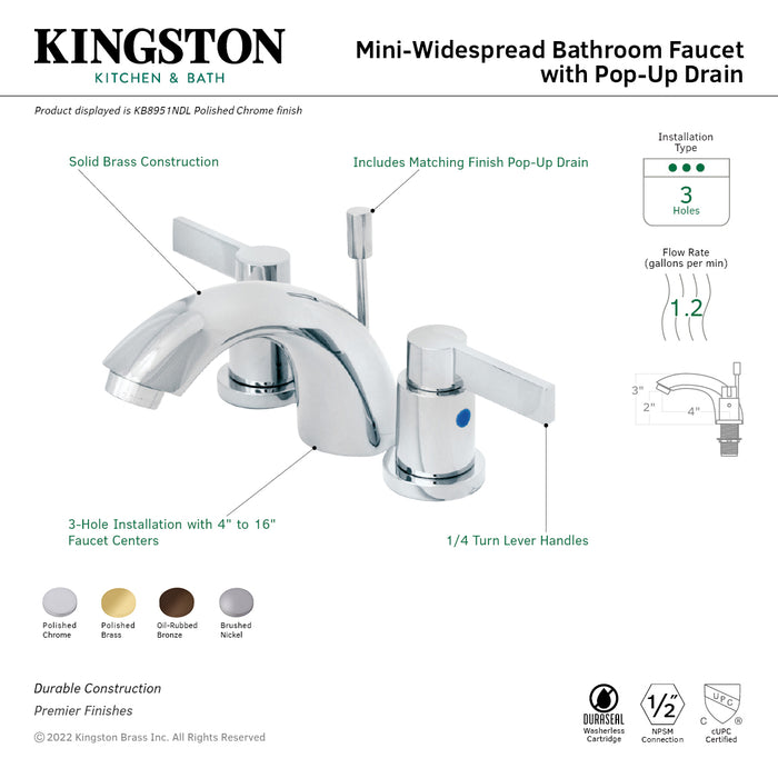 Kingston Tulare KB8958NDL - NuvoFusion Two-Handle 3-Hole Deck Mount Mini-Widespread Bathroom Faucet with Pop-Up Drain, Brushed Nickel