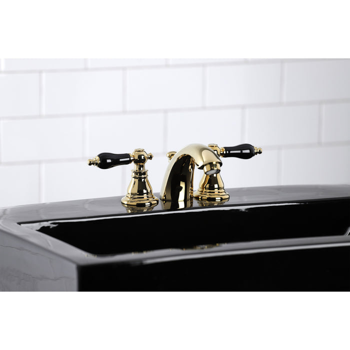 Crafted in commendations to English nobility, the exemplary design of this faucet manifests regality and elegance with its black porcelain handles. Emulating the widespread look, mini-widespread bathroom faucets are for those that love detailed facets and clean lines. These compact faucets provide all of the design elements of a quality faucet without the need for a deck plate in 3-hole sinks. The Duchess mini-widespread bathroom faucet with pop-up drain and its featured sturdy brass construction and premium polished brass finish are guaranteed to glamorize your home's traditional ensemble for years to come. Glamorize your home today with the traditional elegance of this faucet. A matching finish drain is also included.
