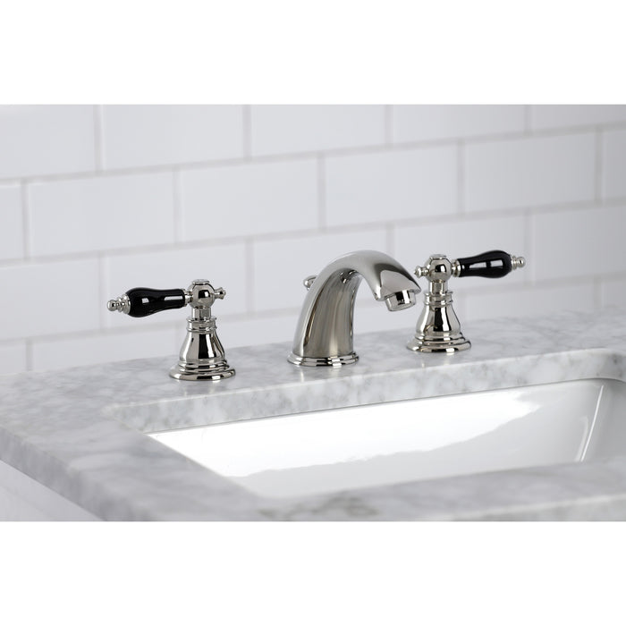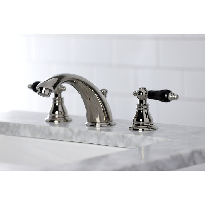 Crafted in commendations to English nobility, the exemplary design of this faucet manifests regality and elegance with its black porcelain handles. Ideal for more spacious bathrooms, widespread faucets are more spread apart and feature a 3-hole installation. The Duchess widespread bathroom faucet with pop-up drain and its featured sturdy brass construction and premium polished nickel finish are guaranteed to glamorize your home's traditional ensemble for years to come. Glamorize your home today with the traditional elegance of this faucet. A matching finish drain is also included.