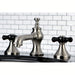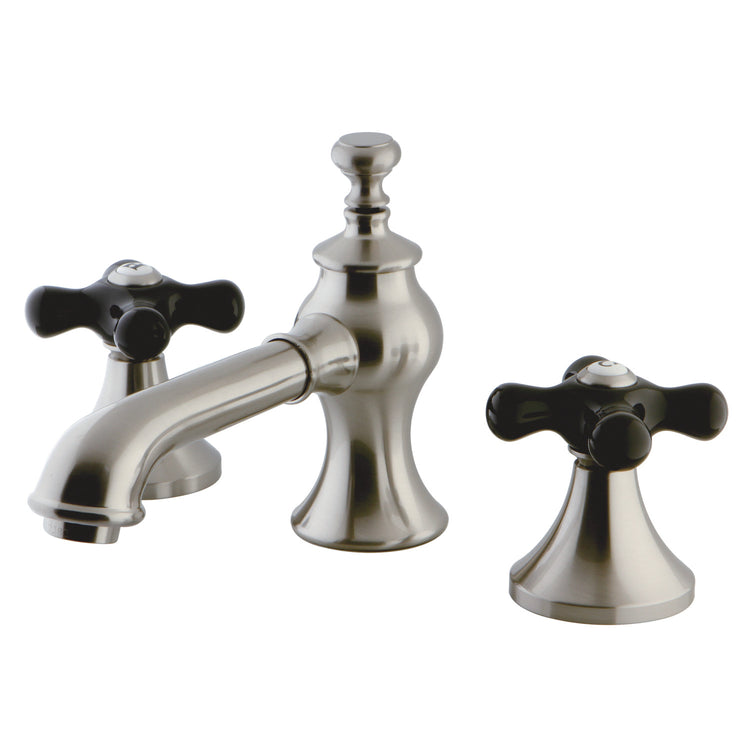 Crafted in commendations to English nobility, the exemplary design of this faucet manifests regality and elegance with its black porcelain handles. Ideal for more spacious bathrooms, widespread faucets are more spread apart and feature a 3-hole installation. The Duchess 8" Widespread Bathroom Faucet, with its featured sturdy brass construction and premium brushed nickel finish, are guaranteed to glamorize your home's traditional ensemble for years to come. Glamorize your home today with the traditional elegance of this faucet. A matching finish drain is also included.