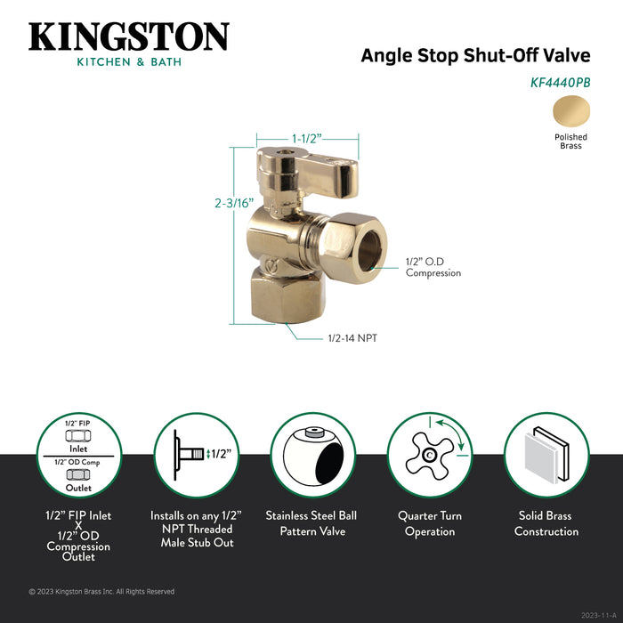 Kingston KF4440PB 1/2-Inch FIP x 1/2-Inch O.D. Comp Quarter-Turn Angle Shut-Off Valve, Polished Brass