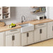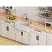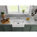 The oversized single bowl farmhouse sink is ergonomically designed with the user in mind. Positioned close to the edge of the counter in a matte white finish, it eliminates back strain from leaning over a more distant basin. With ample room for washing large pots and pans, this sink provides an ease of use that complements its visual appeal as the centerpiece of a traditionally styled kitchen.
