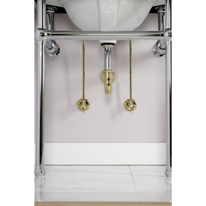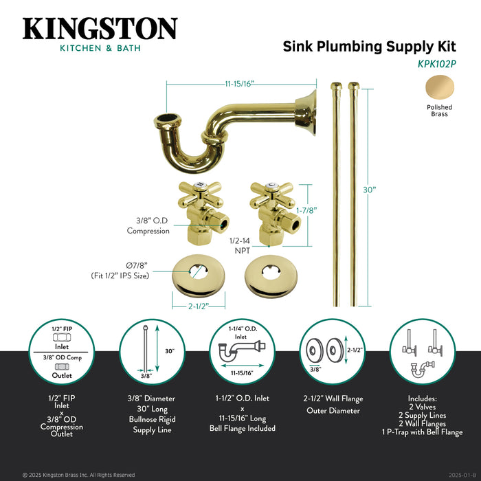 This 7-piece plumbing supply kit from Kingston Brass provides all the necessary parts in the water flow process for your bathroom sink. The set includes two 1/4 turn hardisc angle stops with cross handles, two 30" bullnose supply line, two traditional decorative flanges and a traditional 1-1/4" OD Decorative P-trap. Each of these parts are finished with polished brass and are constructed in solid brass for durability and reliability.