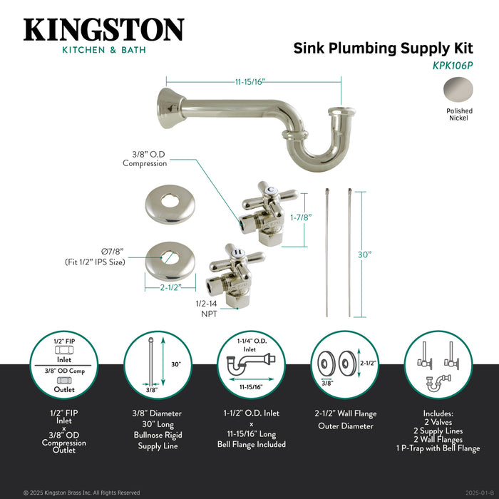 This 7-piece plumbing supply kit from Kingston Brass provides all the necessary parts in the water flow process for your bathroom sink. The set includes two 1/4 turn hardisc angle stops with cross handles, two 30" bullnose supply line, two traditional decorative flanges and a traditional 1-1/4" OD Decorative P-trap. Each of these parts are finished with polished nickel and are constructed in solid brass for durability and reliability.