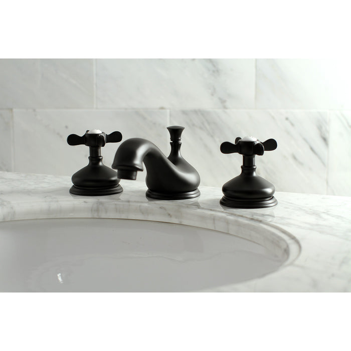 Kingston Heirloom KS1160BEX - Essex Two-Handle 3-Hole Deck Mount Widespread Bathroom Faucet with Brass Pop-Up, Matte Black