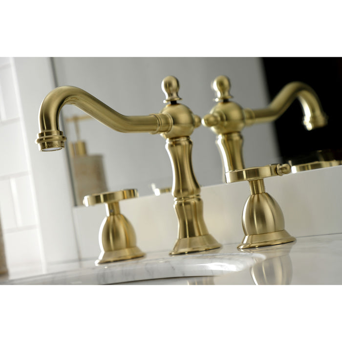 Kingston Heirloom KS1977RX - Belknap Two-Handle 3-Hole Deck Mount Widespread Bathroom Faucet with Brass Pop-Up, Brushed Brass