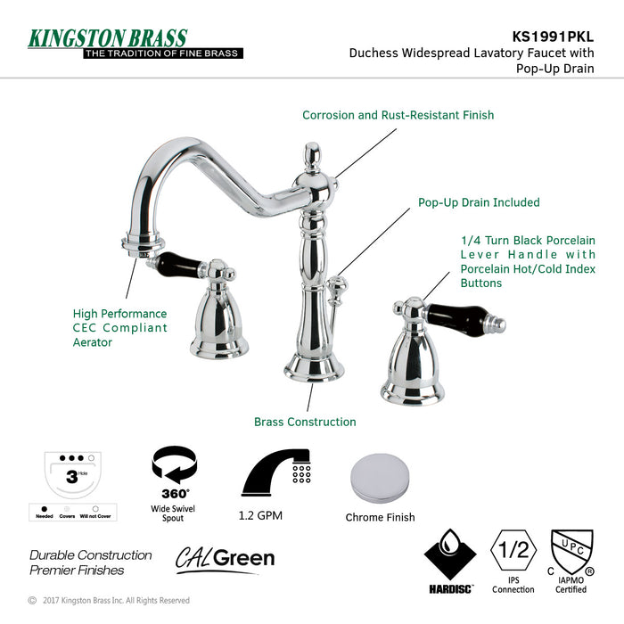 Kingston Heirloom KS1991PKL - Duchess Two-Handle 3-Hole Deck Mount Widespread Bathroom Faucet with Brass Pop-Up, Polished Chrome