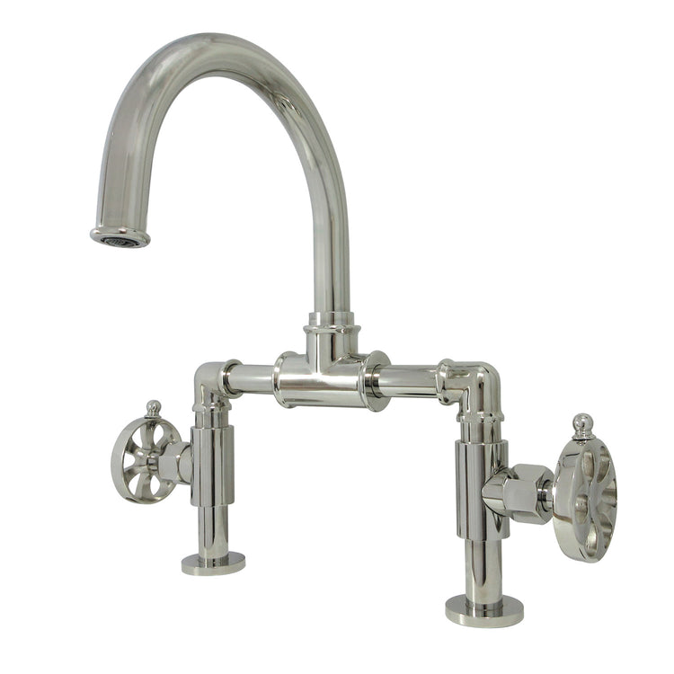 The exquisite design of this faucet tastefully flatters the elegant architecture of traditional homes with its fine detailing. Elegantly designed, the exquisite arch connecting the spout to the handles provides an added aesthetic appeal to make for more of a statement piece. Additionally, the 7-15/16 inch of spout clearance make for a very easy hand washing experience with plenty of room for other tasks. The Belknap industrial style wheel handle bridge bathroom faucet and its featured sturdy brass construction and premium polished nickel finish are guaranteed to glamorize your home's traditional ensemble for years to come. A matching finish push pop-up drain is also included.