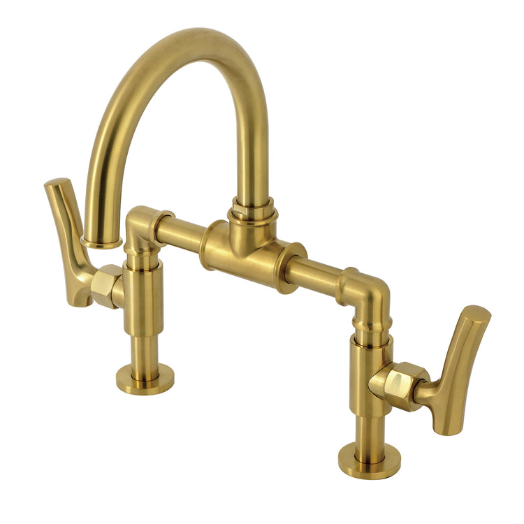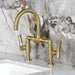 Kingston Sona KS2177TKL - Hallerbos Two-Handle 4-Hole Deck Mount Bridge Bathroom Faucet with Push Pop-Up Drain, Brushed Brass