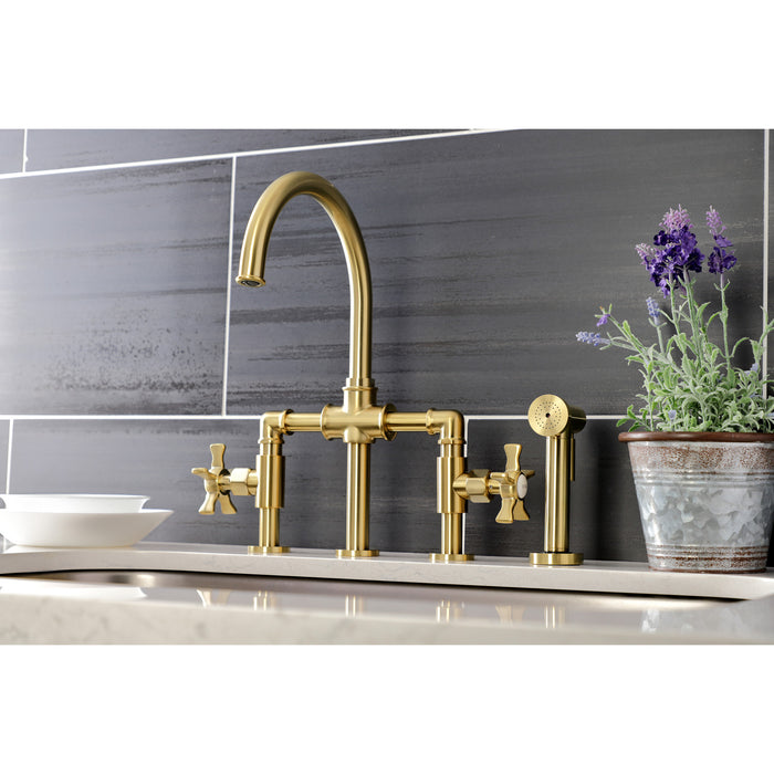 Kingston Sona KS2337NX - Hamilton Two-Handle 4-Hole Deck Mount Industrial Style Bridge Kitchen Faucet with Brass Sprayer, Brushed Brass