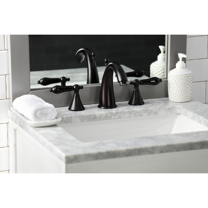 Crafted in commendations to English nobility, the exemplary design of this faucet manifests regality and elegance with its black porcelain handles. Ideal for more spacious bathrooms, widespread faucets are more spread apart and feature a 3-hole installation. The Duchess widespread bathroom faucet with brass pop-up and its featured sturdy brass construction and premium oil rubbed bronze finish are guaranteed to glamorize your home's traditional ensemble for years to come. Glamorize your home today with the traditional elegance of this faucet. A matching finish drain is also included.
