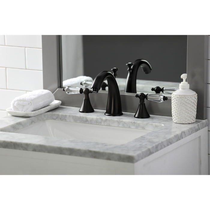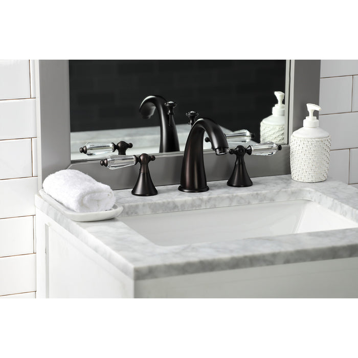 English historical splendor finds itself standing with stunning dignity in the prevalence of the refined acrylic lever handles of this faucet. Ideal for more spacious bathrooms, widespread faucets are more spread apart and feature a 3-hole installation. The Wilshire 8" Widespread Bathroom Faucet, with its featured sturdy brass construction and premium oil rubbed bronze finish, are guaranteed to glamorize your home's traditional ensemble for years to come. Inspire an atmosphere of classical grandeur with the unique appeal of timeless designs with this statement piece. A matching finish drain is also included.
