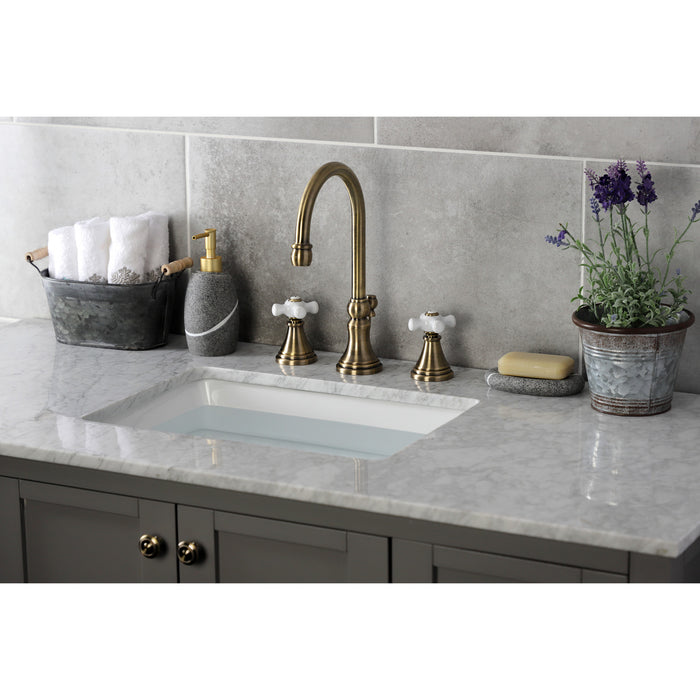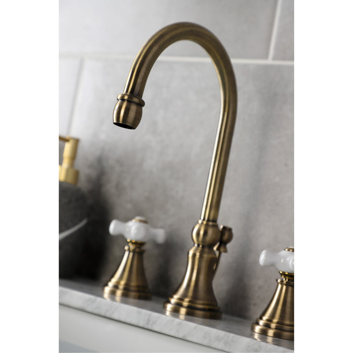 Kingston Tulare KS2983PX - Governor Two-Handle 3-Hole Deck Mount Widespread Bathroom Faucet with Brass Pop-Up, Antique Brass