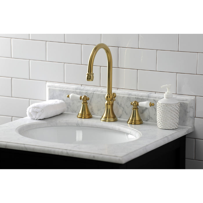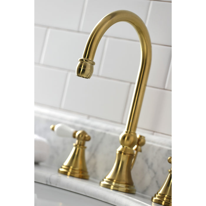 Kingston Tulare KS2987PL - Governor Two-Handle 3-Hole Deck Mount Widespread Bathroom Faucet with Brass Pop-Up, Brushed Brass