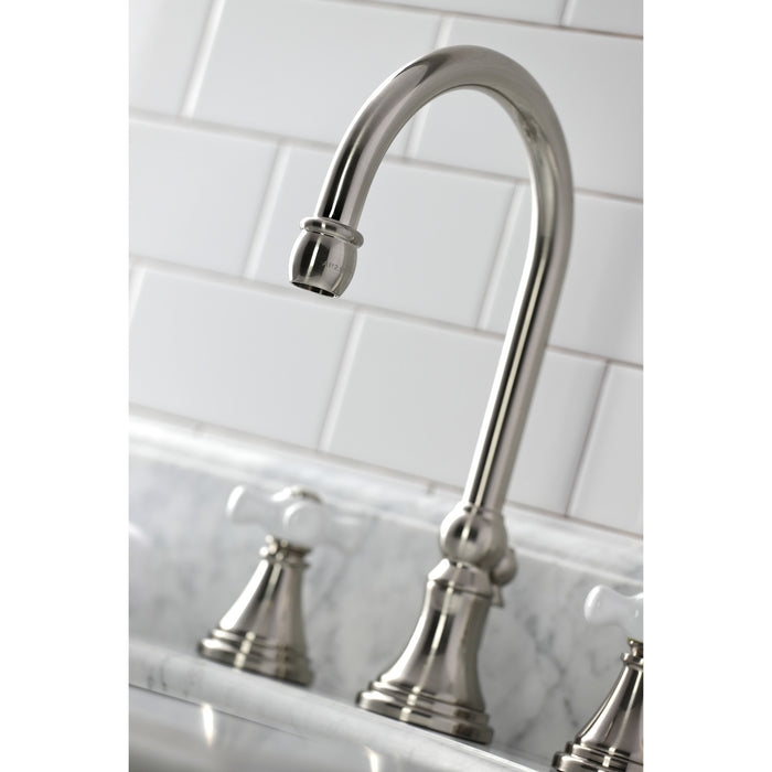 Kingston Tulare KS2988PX - Governor Two-Handle 3-Hole Deck Mount Widespread Bathroom Faucet with Brass Pop-Up, Brushed Nickel