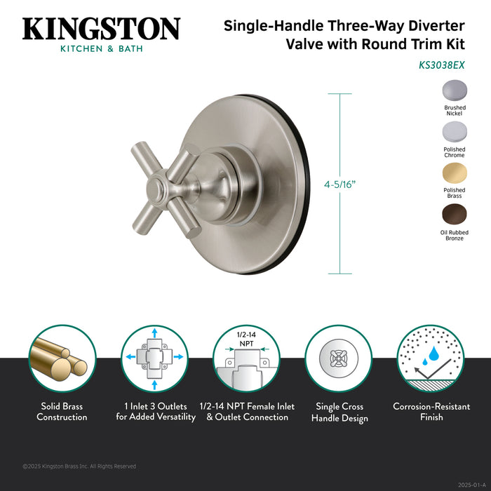 Kingston Tulare KS3038EX - Elinvar Single-Handle Three-Way Diverter Valve with Round Trim Kit, Brushed Nickel