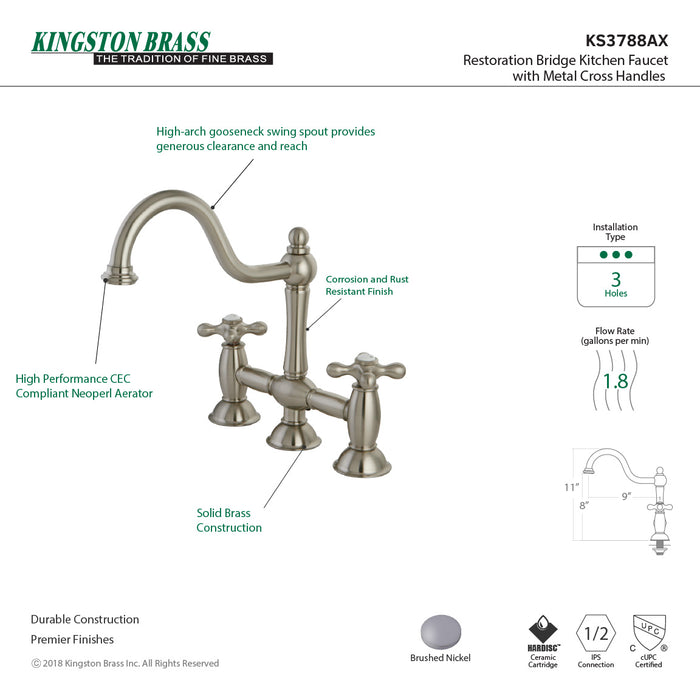 Restoration KS3788AX Two-Handle 3-Hole Deck Mount Bridge Kitchen Faucet, Brushed Nickel